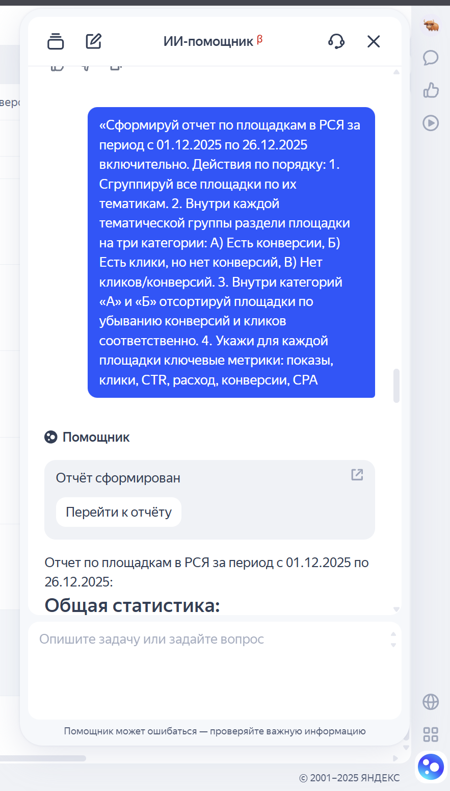 «Сформируй отчет по площадкам в РСЯ за период с 01.12.2025 по 26.12.2025 включительно. Действия по порядку: