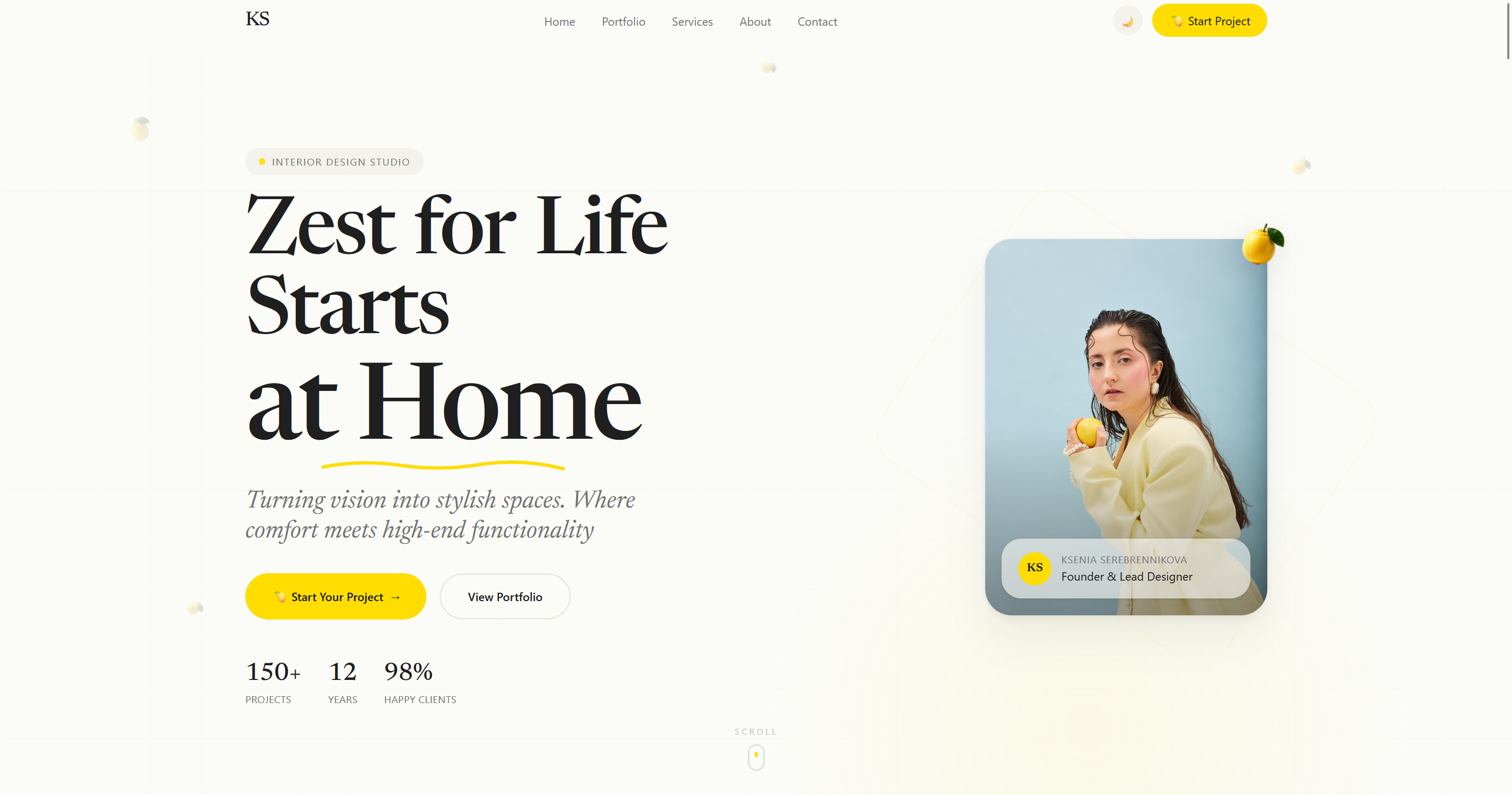 Концептуальный дизайн с анимациями, переключением тем, метафорой лимона — сайт сам стал частью портфолио