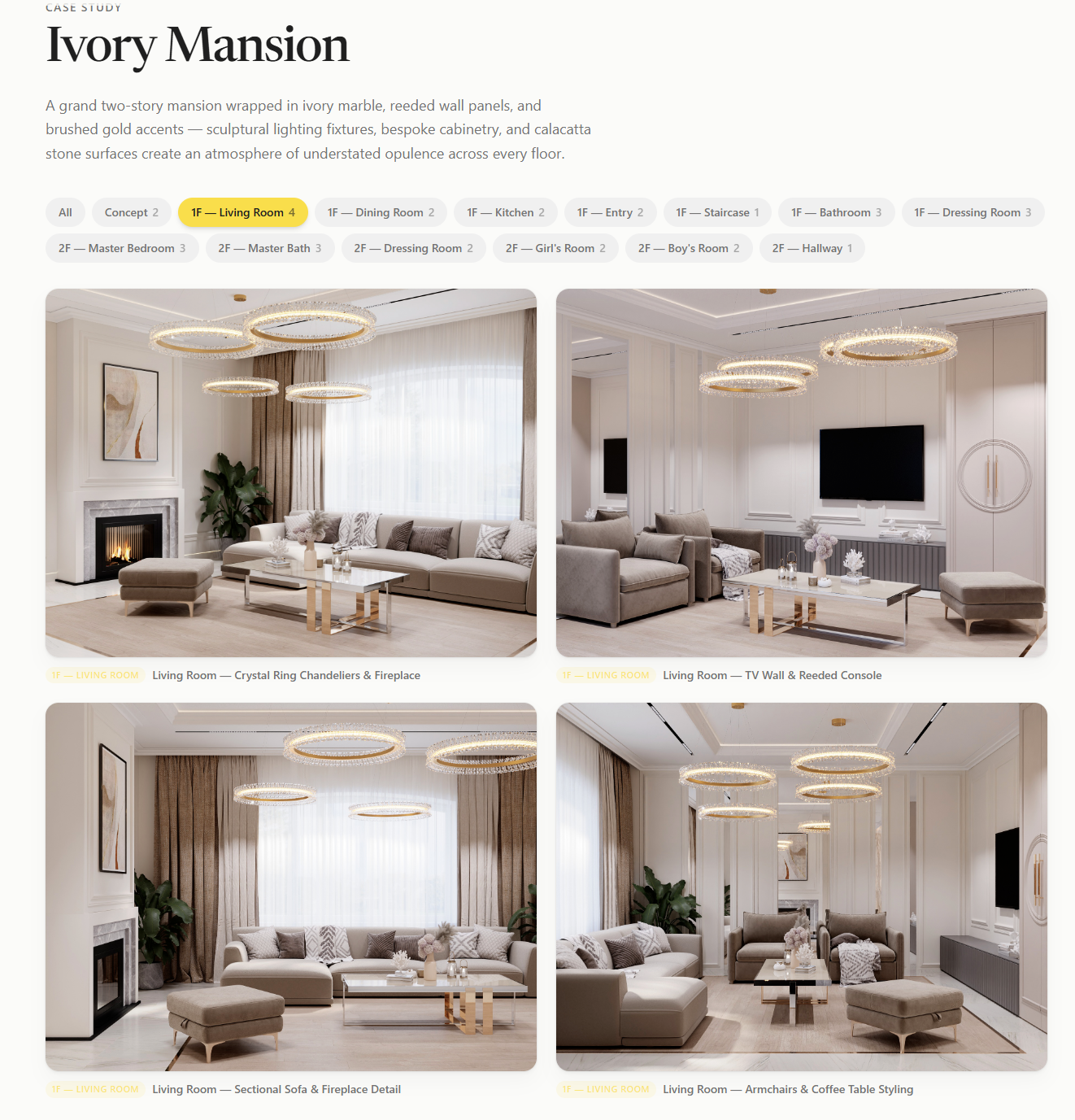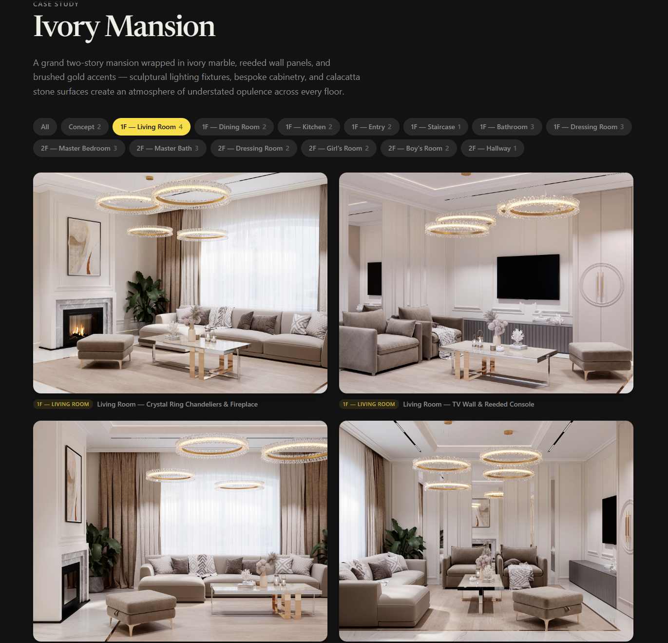 Полностью англоязычный сайт, ориентированный на Калифорнию + мир, с двумя цветовыми темами (яичная скорлупа / чёрный) — идеально для показа интерьеров