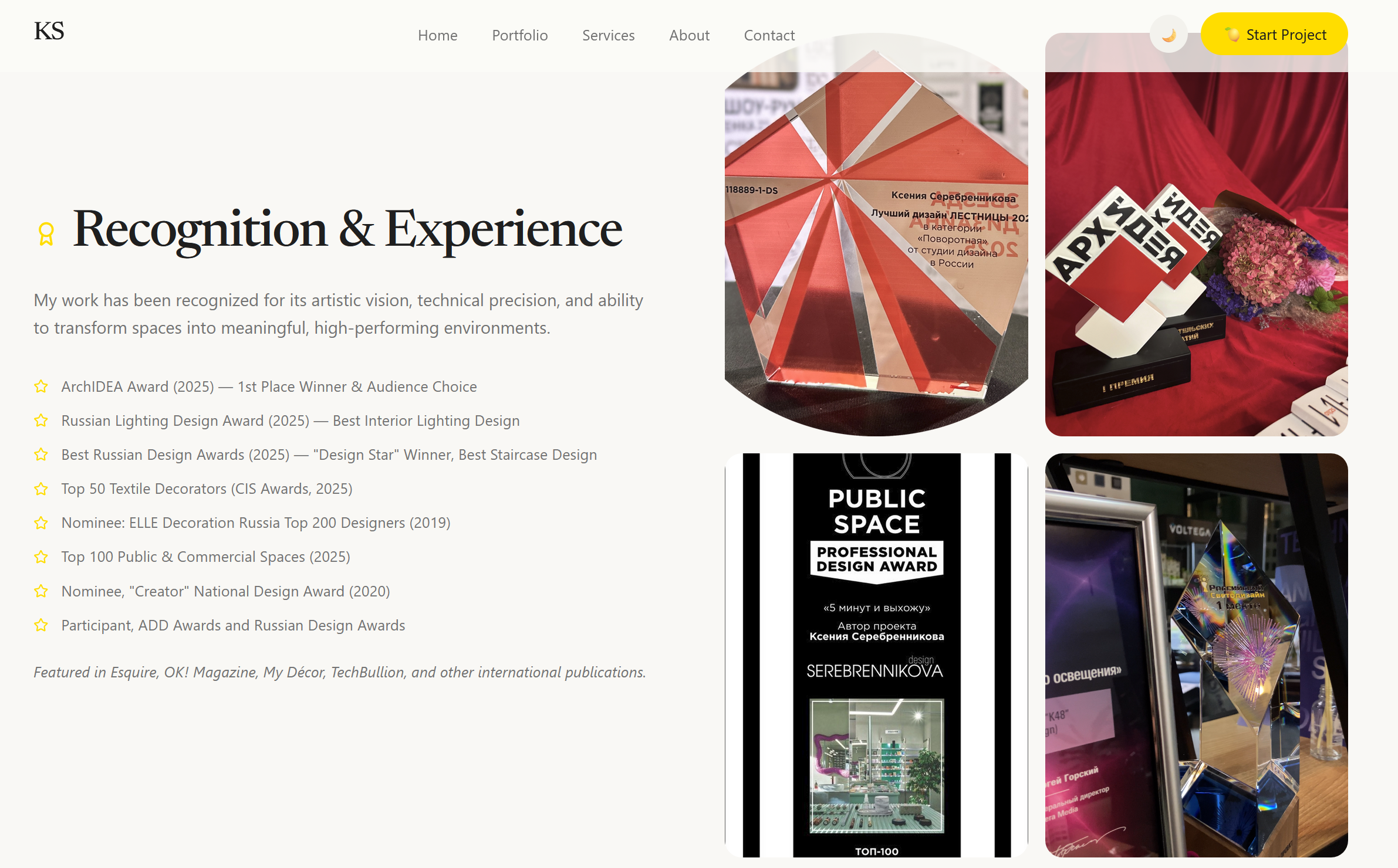 Награды (ArchIDEA Award, Russian Lighting Design Award, Best Russian Design Awards), публикации (Esquire, OK! и др.), Instagram Highlights с живыми отзывами