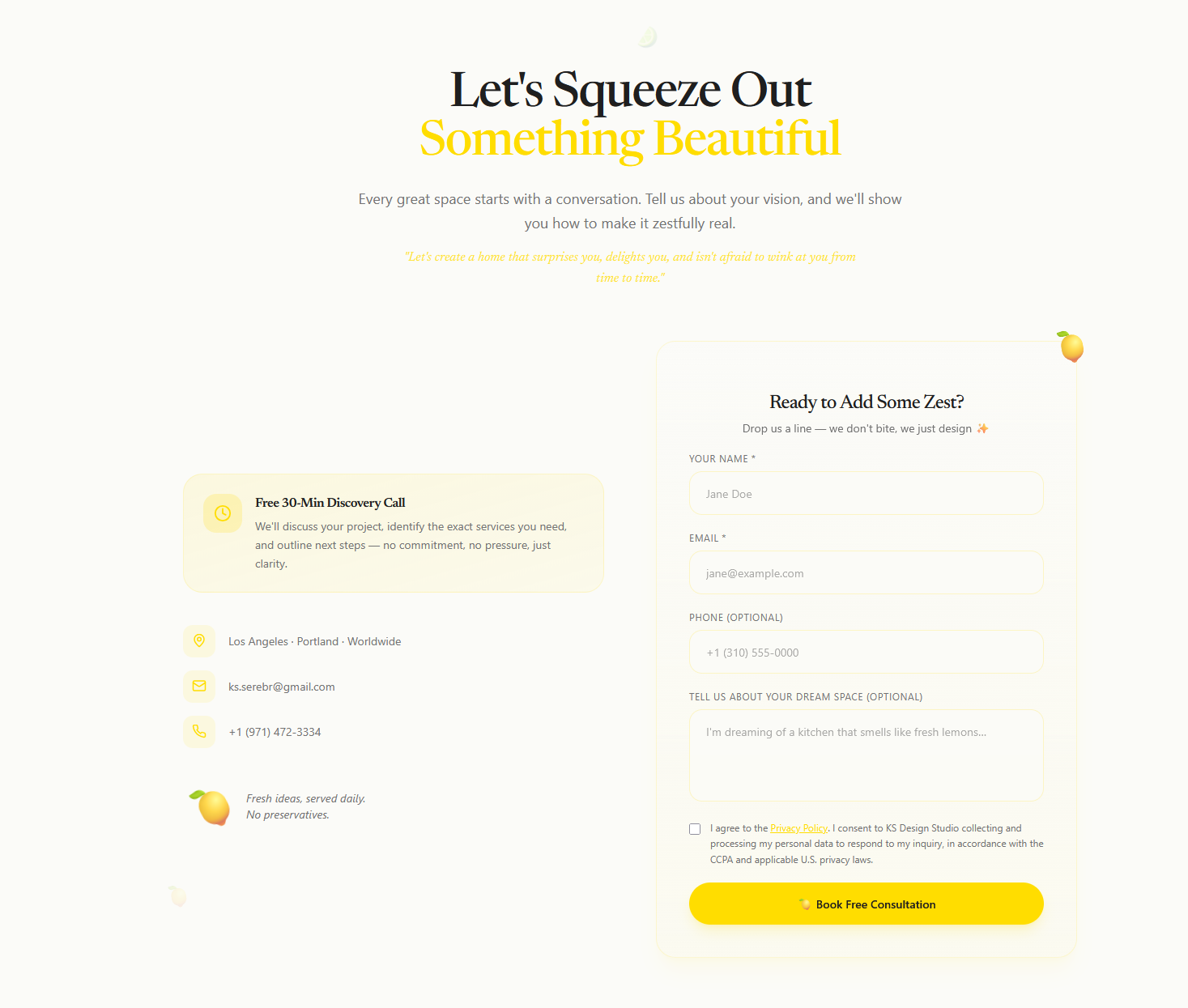 | Бесплатная 30-минутная консультация вшита в 5+ мест: после портфолио, рядом с пакетами, в блоке «О дизайнере», после отзывов, в подвале |